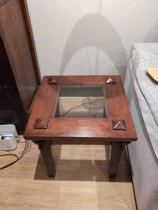 Mesa auxiliar de teka maciza con un diseño oriental perfecta para cualquier rincón de tu hogar. - Estructura de madera robusta. - Encimera de cristal. - Detalles decorativos en las esquinas.