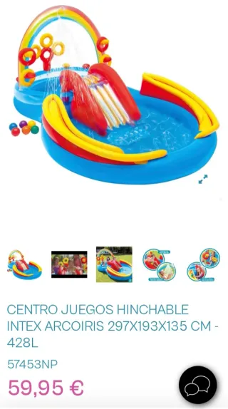 Centro de juegos hinchable Intex con forma circular y un arco superior con pulverizador. Medidas: 297x193x135 cm 2 piscinas: una grande con capacidad para 201 litros/agua y otra más pequeña de 227 litros/agua (tiene más altura que la grande) Incluye: 1 tobogán con base acolchada para amortiguar la bajada, 4 anillos hinchables y encajables, 6 bolas de PE blando deformables y tapón de drenaje
