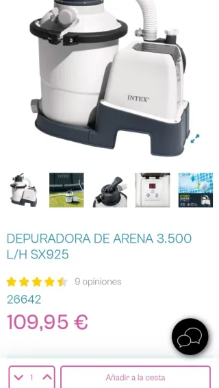 Depuradora de arena SX925 INTEX para piscinas desmontables de tamaño pequeño o mediano Capacidad y potencia: con caudal de 3.500 litros l/h y una potencia de 90W, pensado para piscinas con un máximo de 17.000 litros Capacidad del tanque: mide Ø203 mm y tiene capacidad para 6,5 kg arena de sílice, 5 kg arena de vidrio N º 20 con tamaño de partículas de 0,45 mm hasta 0,85 mm o 200 gramos de bolas filtrantes (no incluida) Conexión y protección: válvula manual con 4 funciones, programación diaria automática con ciclos de 1-12 horas, incluye mangueras con Ø32 mm y abrazaderas para su correcta instalación, protección frente a proyeccio