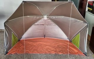 Preciosa sombrilla de playa de la marca Decathlon modelo wiko. Es bicolor, con una combinación de colores verde oliva y naranja. Está fabricada con poliéster y tela resistente. Proteccion UPF 50, para tres personas. - Ideal para la playa o el jardín. - Diseño ligero y plegable para facilitar su transporte y almacenamiento. - Protección solar.