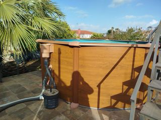 Piscina desmontable Intex con estructura metálica y laterales de plástico. Muy poco uso, esta nueva OPORTUNIDAD! - Diseño imitación madera en tonos marrones y grises. Se entrega con - Escalera incluida para fácil acceso. -Viene con depuradora (3 filtros) -Lona inferior antipinxazo Nueva costo 500€