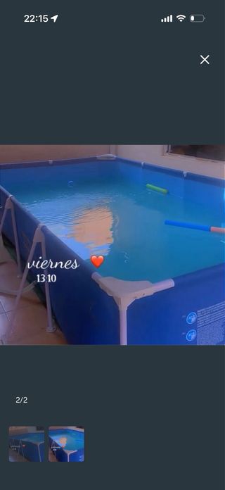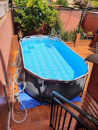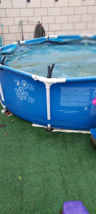 Piscina desmontable para disfrutar del verano, se ha usado un par de veces solo. - Estructura de metal y plástico resistente. - Funda para taparla, y varios necesarios