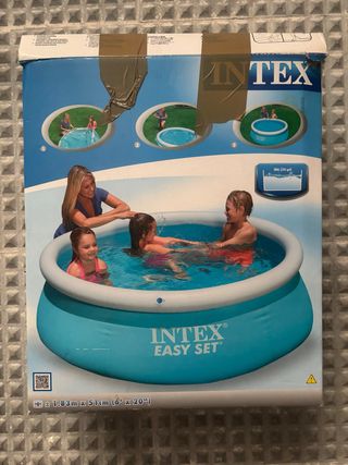 Piscina desmontable de la marca Intex. - Color azul y blanco. - Fabricada en plástico resistente. Entra también la depuradora, un filtro, un set de cloro y una tapa para la piscina