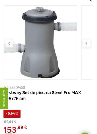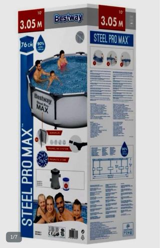 Piscina desmontable Bestway Steel Pro MAX de 3.05 metros de diámetro. Fácil de montar y desmontar. - Estructura metálica resistente. - Lona de alta durabilidad. - Incluye depuradora y accesorios. Vendo piscina Bestway Steel Pro MAX, en perfecto estado. Comprada el 21 de julio de 2025. - tiene un solo uso, y solo se llenó dos palmos. (Lo que se puede ver en las fotos) Incluye todas las cajas y bolsas originales. - no se ha utilizado cloro - Tiene una capacidad de agua de 4678 | (90%) - El juego de piscina incluye una piscina, una depuradora con un caudal de 1249 l/h y un parche de reparación. La depuradora esta sin usar.
