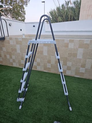 Escalera para piscina en buen estado. Es de metal y plástico, con una estructura resistente. - Ideal para piscinas elevadas. - Fácil de montar y desmontar. - Diseño ligero y práctico.