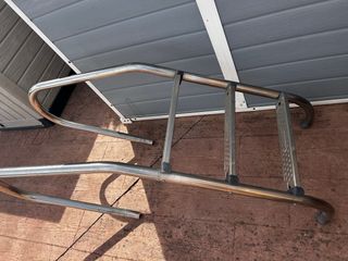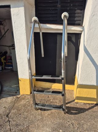 Escalera de piscina de acero inoxidable, en buen estado. - Ideal para facilitar el acceso a la piscina. - Tres peldaños. - Estructura robusta y resistente para empotrar en borde. - tambienncompatible con lamina armada y cloracion salina - Para recoger en Mota del Cuervo (CLM)