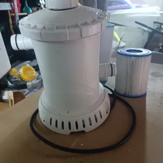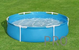 Piscina infantil, de unos 3m de diámetro y 55 cm de profundidad. Se entrega con depuradora, 6filtros de repuesto, dos juegos de tuberías, lona para cubrirla, bote clorador y tiras de medida de acidez. El borde de la piscina es inflable y perde aire, aunque se puede utilizar la piscina sin problema.