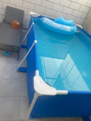 Piscina familiar rectangular para niños, ideal para disfrutar del verano. Incluye depuradora para mantener el agua limpia. - Medidas: 214cm x 152cm x 67cm. - Depuradora con caudal de 2,1m³/h. - Estructura metálica y lona de plástico resistente. - Se encuentra en buen estado.