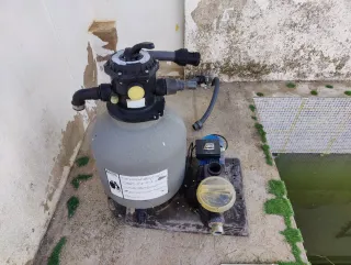 Se vende depuradora de arena para piscina en buen estado. Es de color gris y está hecha de plástico y vidrio. - Ideal para mantener limpia el agua de tu piscina. - Fácil de instalar y usar. - Incluye todos los accesorios que se ven en la imagen.