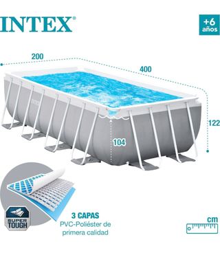 Piscina Desmontable Intex 400 x 122 x 200 cm Marca Intex Capacidad 8400 Litros Dimensiones del producto 4l. x 2an. x 1,22al. metros FormaRectangular Colorgris Material Cloruro de polivinilo (PVC)