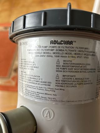 Bomba de filtración para piscinas Bestway Flowclear. - Modelo Flowclear. - Voltaje 220-240V, 50Hz. - Potencia 16W. - Protección IPX7/IPX5.