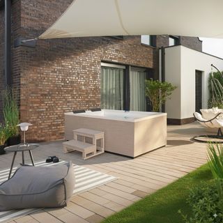 Datos técnicos Dimensiones del jacuzzi (L x An x Al): 190 x 140 x 70 cm Dimensiones de la funda térmica (L x An x Al): 191 x 141 x 10-6 cm Dimensiones de la escalera (largo x ancho x alto): 63 x 54 x 40 cm Material: Acrílico Material del marco: madera Material del delantal: Estructura de panal de plástico Color: Blanco Capacidad: 950 litros Bomba de agua: 1500 W (220 V / 50 Hz) Calefacción: 2000W (220V/50HZ) Ozono: 5 W Boquillas: 18 Iluminación subacuática: 3 W Peso del hidromasaje: 153 kg Peso de la funda térmica: 12 kg Peso de la escalera: 13,5 kg - Revestimiento exterior en tonos beige y marrón. Transporte y Impuestos NO INCLUIDO