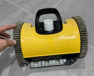 Limpiafondos de aluminio. Mide 45 cm con cuatro ruedas. Cepillo de arrastre, conexión manguera 38 mm. Usado menos de un mes