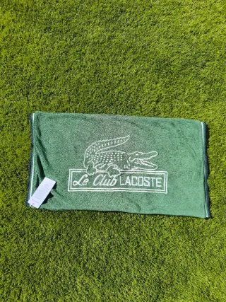 Toalla de la marca Lacoste con el logo Le Club Lacoste bordado. TIENE BOLSILLO, IDEAL PARA GUARDAR COSAS O HACERLA COJÍN EN PLAYA O PISCINA - Diseño del cocodrilo icónico de Lacoste. - Borde con detalles en azul marino.
