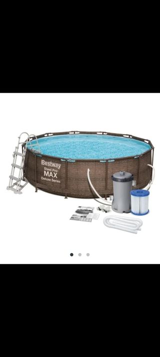Piscina circular Bestway Steel Pro de 3.66 metros de diámetro y 76 cm de altura. Fácil de montar y desmontar. - Capacidad de 6.473 litros (1.710 galones). - Sistema Framelink para una conexión segura. - Estructura metálica resistente. - Depuradora de cartucho - Tiene un par de poros por eso su precio