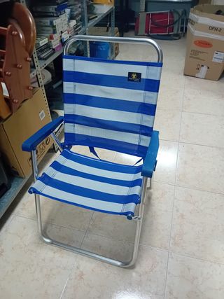 Dos sillas de playa plegables, ideales para disfrutar del buen tiempo. Son de color azul y parecen estar en buen estado, aunque presentan algunas señales de uso. - Plegables para facilitar su transporte y almacenamiento. - Perfectas para la playa, piscina o jardín.