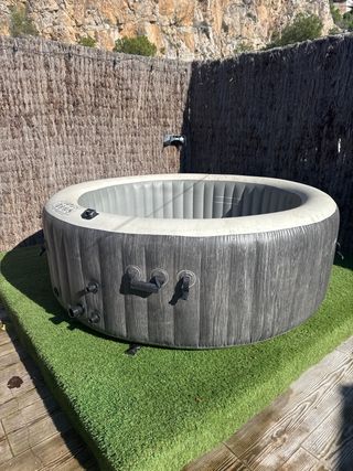 Jacuzzi inflable con un diseño moderno y elegante. - Exterior con acabado imitación madera. - Interior en color blanco. - Válvulas de inflado y desinflado.