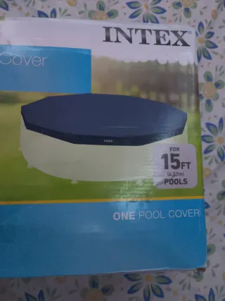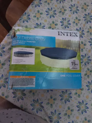 Cubierta para piscinas redondas Intex de 15 pies de diámetro. - Protege tu piscina de hojas y escombros. - Incluye un voladizo de 10 pulgadas (25 cm). - Cuerda para asegurar la cubierta y evitar que se vuele con el viento.
