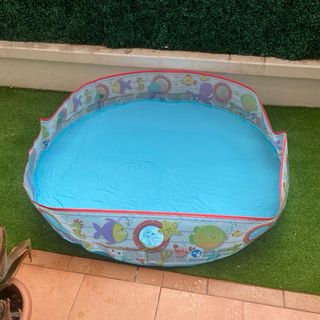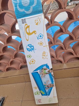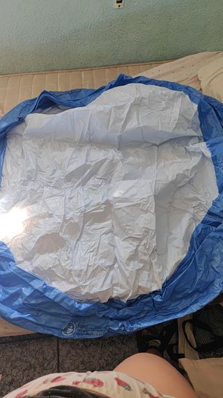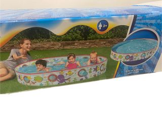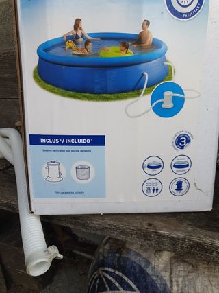Piscina hinchable de gran tamaño, perfecta para disfrutar del verano. Tiene su propia depuradora. - Color azul y blanco. - Material de plástico resistente. De regalo: funda ajustable y recipiente para el cloro. Y también el suelo antideslizante Solo la hemos usado este verano.