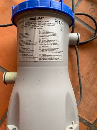 En perfecta condiciones Bomba de filtración para piscinas Bestway. - Modelo #58386. - Voltaje: 220-240V. - Frecuencia: 50Hz. - Potencia: 32W. - Protección: IPX7 / IPX5. - Altura mínima de agua: 0.19m.