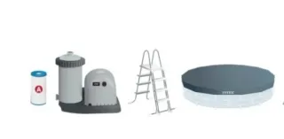 Sistema de filtración para piscinas, diseñado para mantener el agua limpia y clara. Incluye mangueras y accesorios. - Manguera corrugada blanca. - Filtro de succión. - Conexiones y adaptadores.