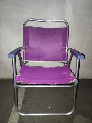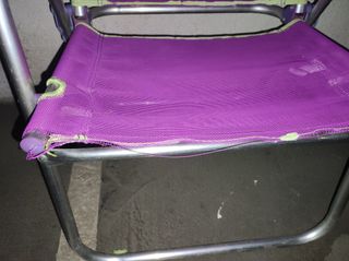 Vendo silla playa de color lila, medidas abierta 75-65-45 y plegada 75x45, tiene un desgarro de tela que se ve en la segunda foto.