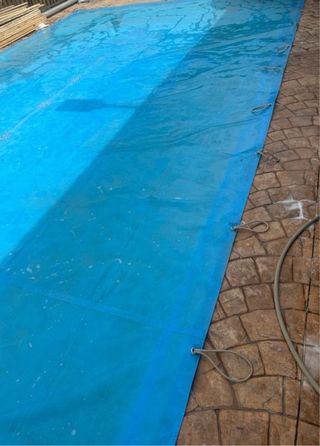 Cubierta para piscina, ideal para proteger el suelo. Es de color azul y está en buen estado. - Medidas: 9ft x 9ft (2.74m x 2.74m) - Material plástico resistente.