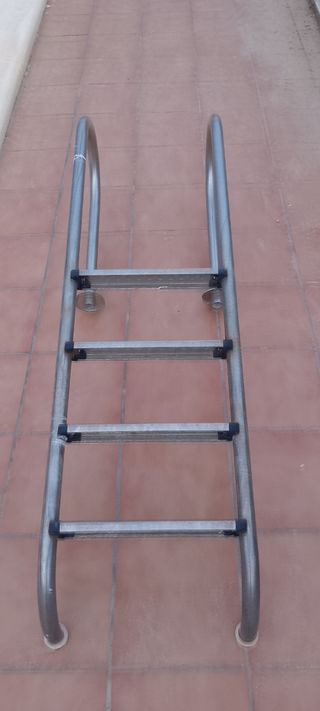 Escalera para piscina en buen estado. - Fabricada en metal resistente. - Diseño sencillo y funcional. - Cuatro peldaños para facilitar el acceso. Longitud entre peldaños 26cm. Total 180cm Ancho 52,5cm Diámetro tubo 40mm