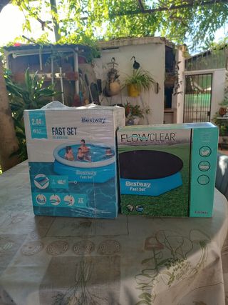 Piscina hinchable Bestway Fast Set de 2.44 metros de diámetro, ideal para disfrutar en familia. Incluye una cubierta para mantener el agua limpia. - Fácil de montar y desmontar. - Incluye cubierta protectora.