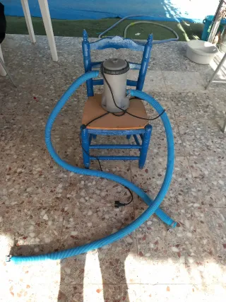 Depuradora para piscina, fácil de montar y transportar. - Incluye manguera azul. - Filtro de plástico. - Estructura de madera.