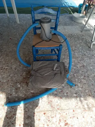 Vendo por mudanza.Recoger en Elche. Piscina hinchable de 240x67cm, la hemos usado 2 agostos, sigue funcionando perfectamente. Incluyo, limpiadora de aluminio de 3 metros, seta para cloro un poco rota pero funcions, filtros lavables reutilizables, funda de 3metros para taparla de noche, creo que me quedan tests de cloro para regular el cloro. Se hincha el anillo de arriba de aire y cuando se llena de agua va subiendo hasta la altura que quieras. Mis hijos se lo pasan bomba y nosotros los adultos nos metemos para refrescarnos y super bien. La vendo pq no tengo sitio donde ponerla.