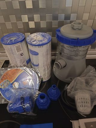 Se vende bomba de filtro para piscina portátil sin usar. Incluye dos cartuchos de filtro y accesorios. - Bomba de filtro para piscinas. - Dos cartuchos de filtro de repuesto. - Accesorios de conexión. - Manual de Splash Play en formato CD. - Folleto de manual.