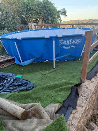 piscina para montar medidas 76cm alto x 3,66m diametro. se vende con filtro de tierra y tela, bomba incluida. Se incluye escalera
