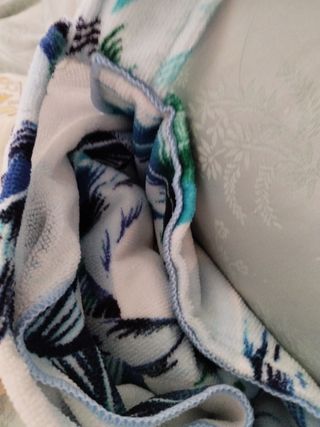 Preciosa bolsa de playa hecha con una toalla de rizo, la toalla plegada se convierte en bolso. Es tamaño estandar y perfecta para llevar lo esencial. - Diseño con estampado de hojas en azul y blanco. - Asa para llevarla cómodamente en la mano o el hombro. - Ideal para la playa, piscina o cualquier salida.