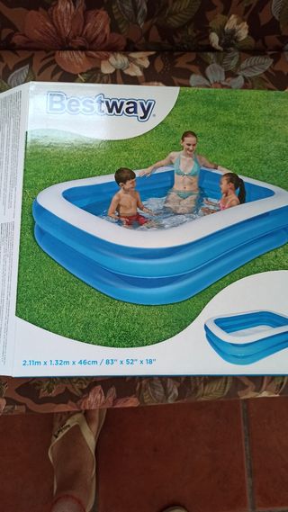 Piscina Bestway 2,11m x 1,32m x 46cm. Funda protectora incluida y suelo puzle de goma EVA 50x50. La vendo porque he usado todo solo dos veces.