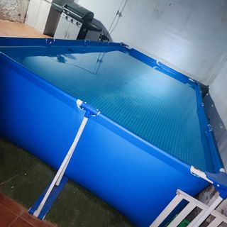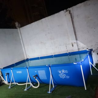 Piscina rectangular de metal, ideal para disfrutar en el jardín o exterior. Fácil de montar y desmontar. - Dimensiones: 228 x 159 x 42 cm. - Color: Azul. Además incluyo toldo de plástico para cubrirla, 2 dosificadores de cloro flotantes, parches y un recogedor de hojas.