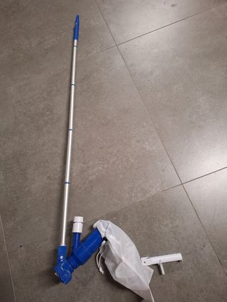 Limpiafondos para piscinas, en buen estado. Incluye una bolsa de tela blanca para recoger la suciedad y un accesorio extra. - Mango telescópico de aluminio. - Cepillo para una limpieza eficaz. - Fácil de usar.