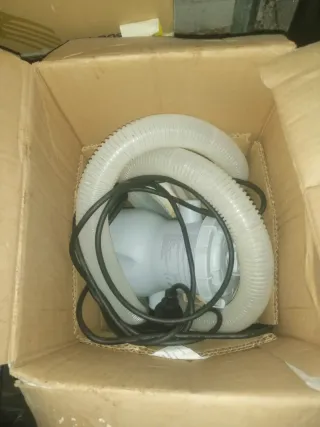 Bomba de agua usada para estanque, piscina o fuente. Está en buenas condiciones, aunque muestra señales de uso. - Ideal para sistemas de riego o fuentes ornamentales. - Incluye filtro. - Conexión de tubería de metal.