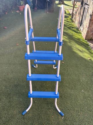 Escalera de piscina de acero inoxidable usada. Ideal para piscinas elevadas o enterradas. - Estructura resistente y estable. - Se encuentra en buen estado, aunque con algunas señales de uso.