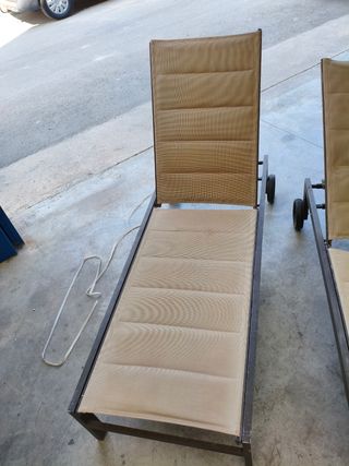 Se venden dos tumbonas de exterior en perfecto estado. Son de aluminio con tejido color beige. - Ideales para jardín o piscina. - Estructura resistente y ligera. - Diseño elegante y cómodo. Pack de 2 tumbonas de aluminio en color marrón con patas altas y con ruedas. reclinable. en muy buen estado. hamacas. muebles de jardin. exterior. verano. piscina. Pack of 2 brown aluminum sun loungers with high legs and wheels. Reclining. In very good condition. Hammocks. Garden furniture. Outdoor. Summer. Pool.