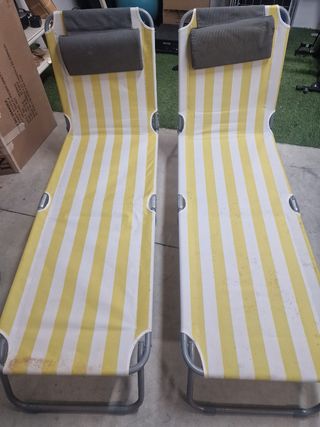 Pareja de tumbonas plegables, ideales para relajarse al aire libre. Se encuentran en buen estado, aunque presentan algunas manchas. - Diseño de rayas amarillas y blancas. - Mecanismo de plegado para facilitar su almacenamiento. - Incluye dos reposacabezas y asas para transportar.