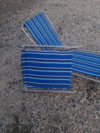 Dos tumbonas plegables ideales para la playa o piscina. Son fáciles de transportar y guardar. En el maletero 45€ casa una son dos no envios solo en persona muy cómodas no pesan nada y fácil de plegar - Estructura metálica resistente. - Tejido de rayas azules y blancas.