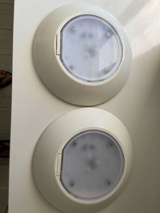 Se venden dos focos para piscina. Son de color blanco y están hechos de plástico. Están en buen estado, aunque uno presenta algunas marcas superficiales. - Ideales para iluminar tu piscina. - Fácil instalación. - 2 unidades incluidas.