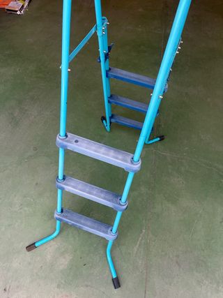 Escalera para piscina infantil, en buen estado. Ideal para piscinas elevadas. - Estructura resistente. - Tres peldaños por cada lado. - Fácil de montar y desmontar. MEDIDA HASTA LA BARRA 1,26m altura completa hasra la curva 1,48m