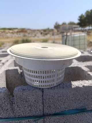 Skimmer redondo para piscina, en color blanco y hecho de plástico. Es un skimmer usado, en buen estado. - Diseño redondo. - Ideal para piscinas.