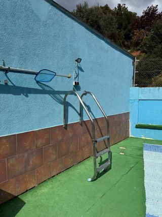 Escalera para piscina en buen estado. Ideal para facilitar el acceso a piscinas elevadas. - Dos piezas de escalera. - Diseño resistente y duradero. - Fácil de montar y desmontar.