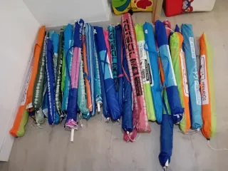 Lote de sombrillas de playa seminuevas. En el precio están incluidas todas las sombrillas ( 48 unidades), dos tablas y una esterilla. Todo en perfecto estado.