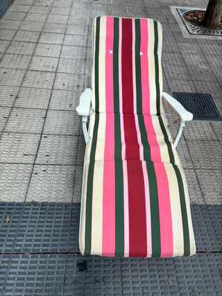Preciosa tumbona para playa, piscina o jardín. Es plegable y reclinable, en 6 posiciones distintas. - Diseño de rayas en tonos rosas y verdes. - Estructura metálica blanca y ligera. - Acolchada y muy cómoda. - La funda se puede sacar y meter en la lavadora.
