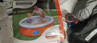 Bestway Steel Pro con depuradora a estrenar. Incluye cobertor y dosificador de cloro Flow Clear Bestway 58071, igualmente a estrenar. Embalajes originales sin abrir.