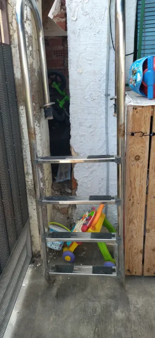 Escalera de aluminio con cuatro peldaños, diseñada para piscinas. - Estructura robusta de metal. - Peldaños con superficie antideslizante de plástico. Lleva los taquetes para colocar en la piedra de la piscina, está nueva, tal cual en la imagen se ve